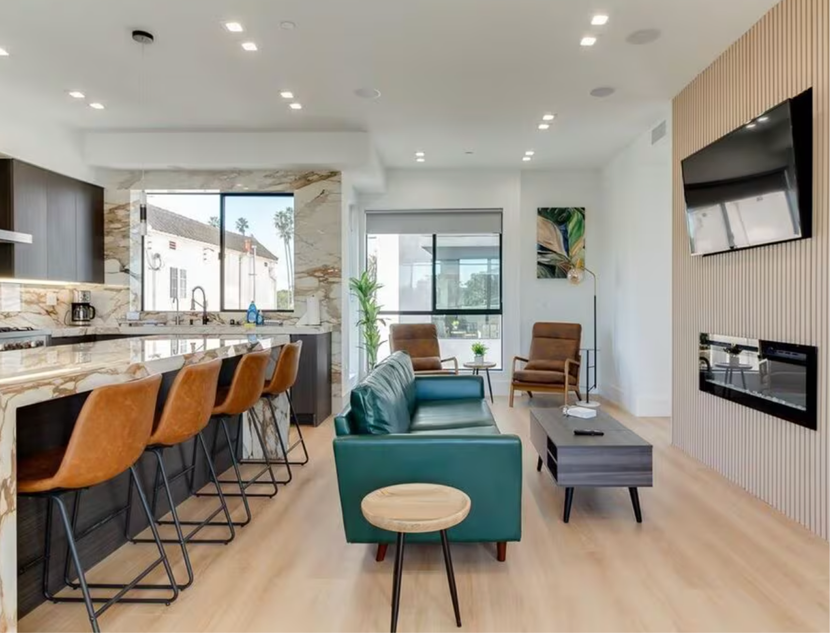 Two adjacent four story homes with rooftops, and beautiful modern interiors where we live and work